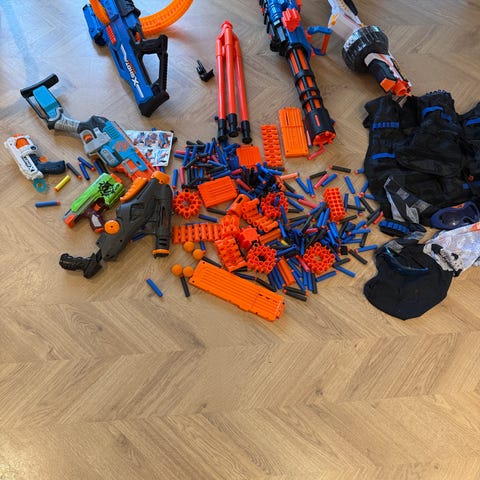Er man x shot , nerf fan er her en kæmpe pakke med bl.a barrel Gun. Insanity clip blaster og meget andet. Det hele virker som det skal og er i rigtig fin stand. Det hele sælges samlet for 950,- afhentet. (Der er for cirka 2200-2500 nypris)