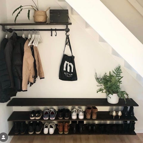 Rack Buddy bøjlestang inklusiv hylde. Bøjlestangen er i sort og hylden er i mørk / sort træ. Målene er 90 cm i bredden / længden og 30 cm i dybden. Alle søm mm. medfølger.