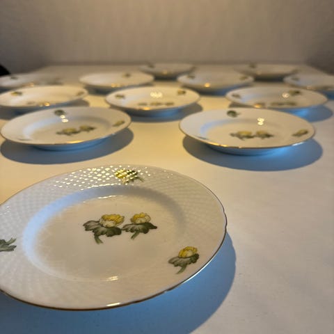 Det er primært spisestel i form af frokost- middags- og suppetallerkener samt en masse fade i større dimensioner, store skåle med låg mv.