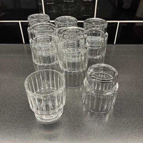 12 flotte drikkeglas af navnet LINES fra Sinnerup. Glassene måler 14 cm med en diameter på 7,5 cm i toppen. De er nemme at stable. De har aldrig været brugt, blot stået i æskerne og samlet en smule støv.