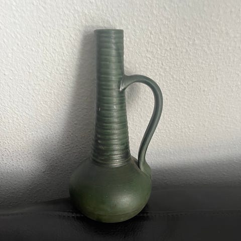 Keramisk vase i grøn farve med en spiralformet design. Vasen har en mat overflade og en unik, snoet form, der gør den velegnet til dekoration i hjemmet.