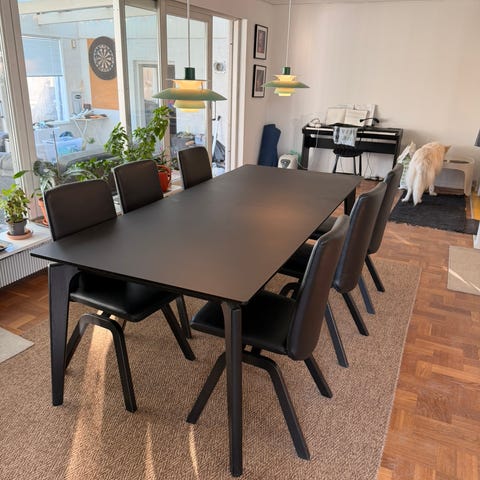 Spisebord. Dimensioner 210x105 cm. Bordplade af højtrykslaminat fra Invita. Enkelte spor efter brug. Stolene er ikke til salg. Giv et bud…