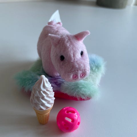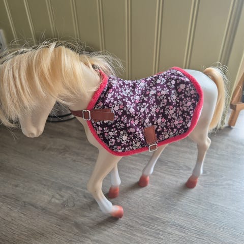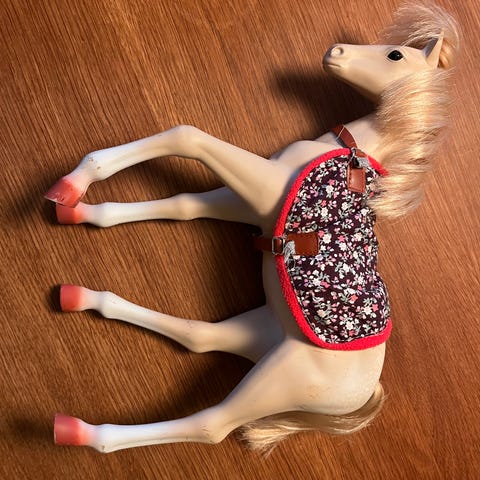 Et broget føl med tilbehør, såsom føllegetøj og lidt mad.