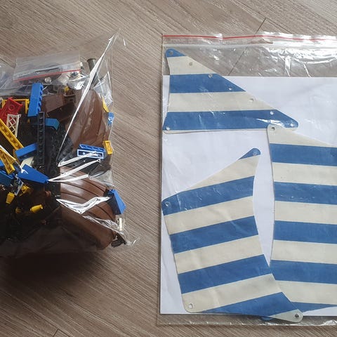 Mangler 2 ud af de 3 sejl, der er knækker clips på de 2 flag