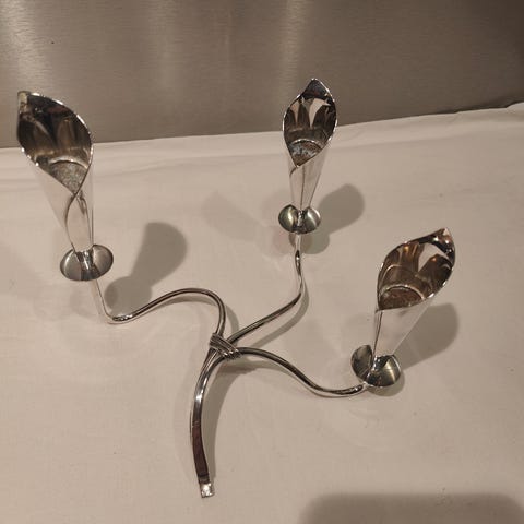 Smukke lysestager i plet sølv af Hans Jensen. De kaldes Calla Lily stager. Højde 13 cm. Stemplet HJ og et par andre stempler. Prisen er for begge.