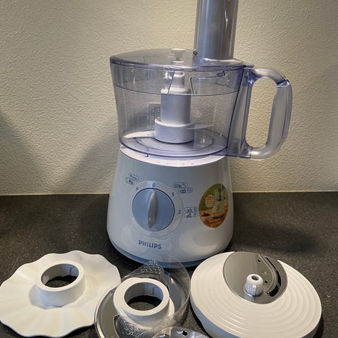 Philips foodprocessor med flere tilbehør, herunder skiveindsatser, citruspresser og opbevaringsboks. Produktet er designet til at håndtere forskellige madlavningsopgaver som hakning, skæring, blanding og presning. Materialet inkluderer plast og metaldele, og enheden er egnet til brug i køkkenet til forberedelse af forskellige fødevarer.