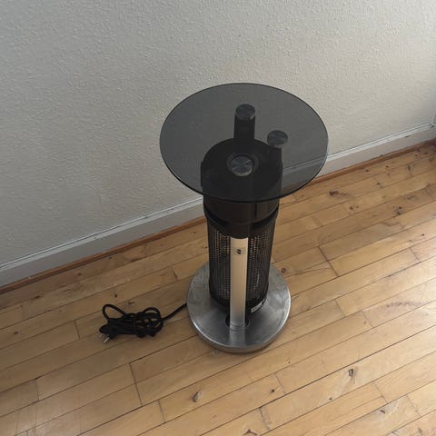 Asserbo AB-101 elvarmer med metalgitter og glasplade på toppen. Effekt 1200-2400W, 220-240V AC, 50Hz. Designet til opvarmning i indendørs rum.