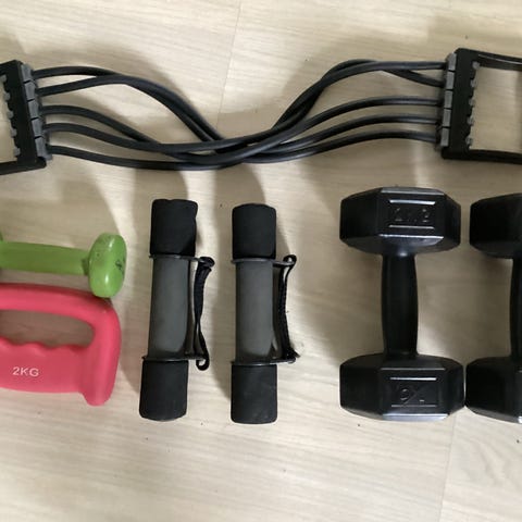 Træningssæt med håndtræner, sjippetov og vægtskiver