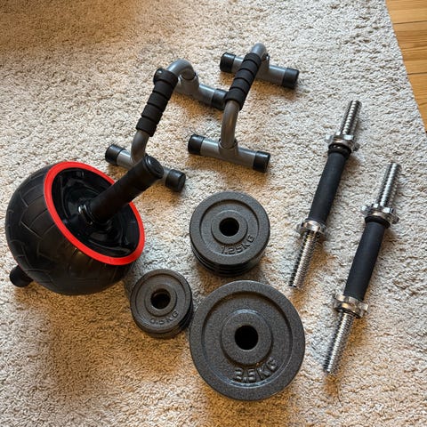 Træningssæt bestående af flere vægtskiver i sort, håndtræner med blå og sorte greb, sjippetov med sort håndtag og en træningsmåtte i sort materiale. Sættet indeholder forskellige vægte til styrketræning og udstyr til konditionstræning.