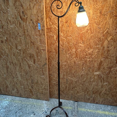 Ældre standerlampe,stel i jern og messing,monteret med skomagerskærm i glas.