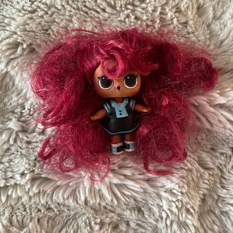 L.O.L dukke med blåt hår, diverse tilbehør og kasse der følger med.