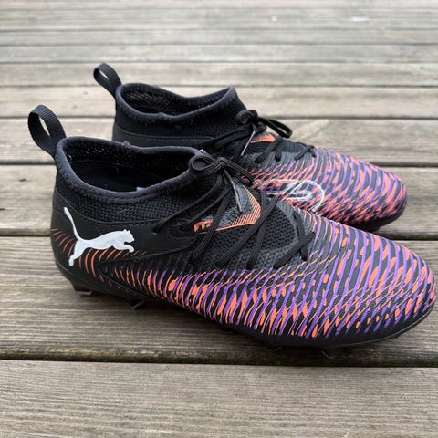 Puma Future Pro FG/AG fodboldstøvler i blå og orange. Støvlerne er designet til brug på fast og kunstigt græs med en kombination af materialer, der giver støtte og fleksibilitet. Str. 42