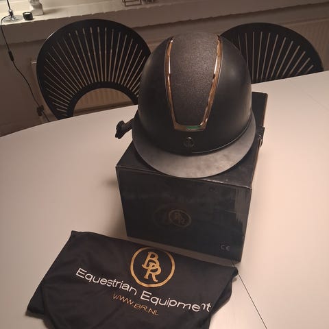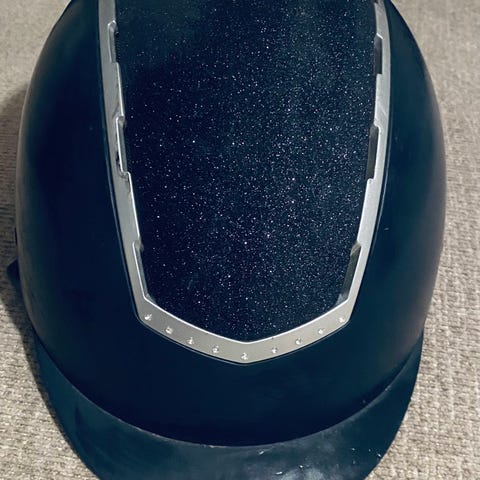 Super lækker ridehjelm i sort farve med sølvdetaljer. Hjelmen har en mat finish og inkluderer ventilationspaneler. Den er udstyret med justerbar hagerem for sikker pasform. Høj kvalitet. Kun brugt et år. Ingen stød eller styrt. Størrelsen passer til et barn på omkring 10-12 år.