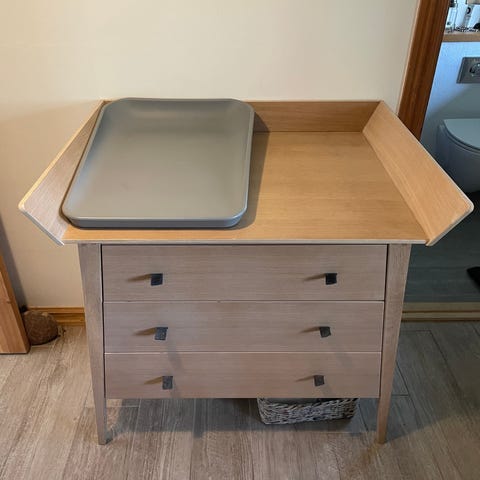 Den er designet med høje kanter, der giver tryghed, når dit barn skal pusles. Samtidig giver den store pusleflade og de tre rummelige skuffer på Leander Luna kommoden god plads.