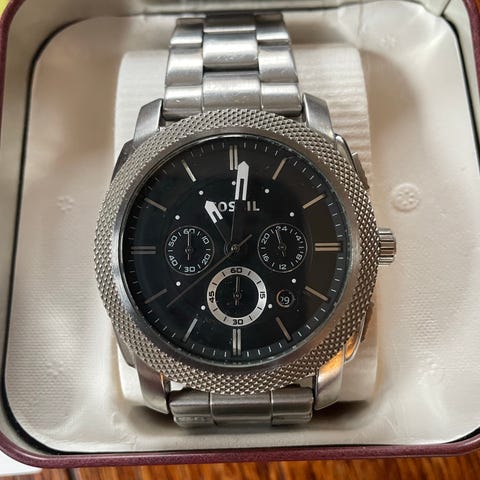 Fossil herreur i stål til mænd med sort urskive og metalrem. Kun 1 ejer. Uret sælges/leveres i original æske med ekstra led til remmen.