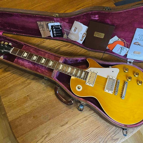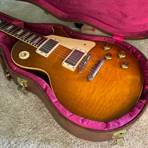 Gibson Les Paul custom shop R8 fra 2018. I Royal tea burst. Den vejer 3,8 kg. Ingen båndslid. Den har en 59’ halsprofil. Så ikke en kæmpe hals som de ældre R8’ere.