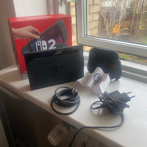 Nintendo Switch 2 konsol med tilbehør inklusive oplader, bæretaske og manual. Der medfølger dbrand skærmbeskytter. Der sidder allerede en glas skærmbeskytter på.