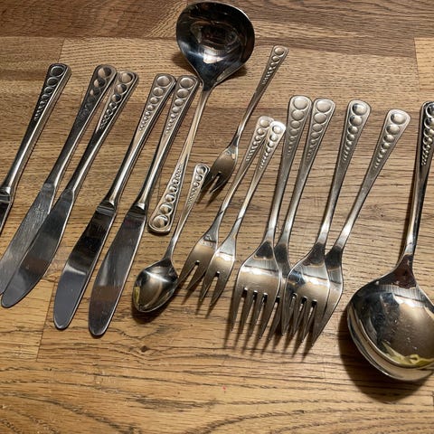 16 skeer, 16 gafler, 12 knive og 9 teskeer.