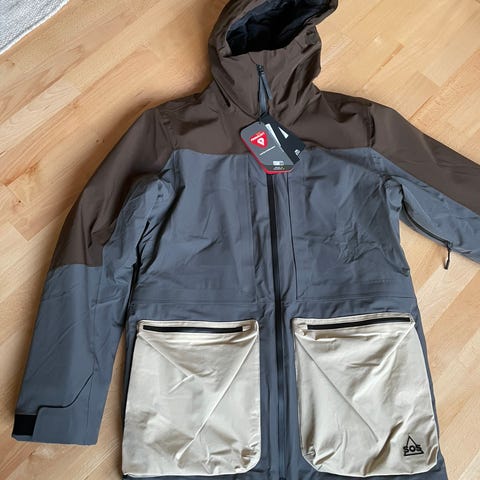 Sprit ny SOS jakke sælges da jeg ikke kommer afsted i år. Jakken er str L og har gode store lommer foran. Der er lynlås under begge arme således at man kan lyne ned for at få lidt luft ind. Lomme til liftkort på armen. Der er naturligvis snefang på den.