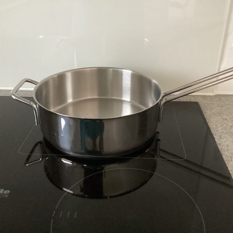 Eva Trio Sauterpande med kuppellåg 24 i diameter. Kuppellåget gør at der kan lavet en hel kylling i gryden. Pande og låg er passet, men med lidt brugsmærker. Nypris: 950