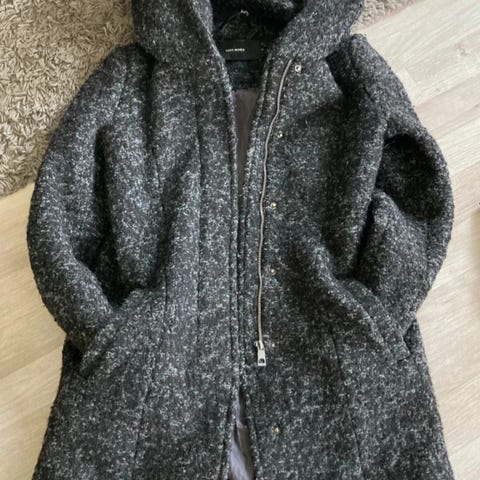 Frakke med hætte og pelskant (kan tages af), lukkes med lynlås + trykknapper, 2 lommer, bånd i livet (strammes/løsnes - figur), elastik i ærmerne, med verteret grønt for. Brugt, men i pæn stand.