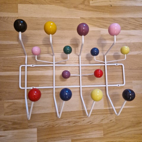 Vitra knagerække med kugleformede ender i træ og metal. Knagerækken har et moderne design og kan bruges til ophængning af tøj, tasker eller accessories i hjemmet eller på kontoret.