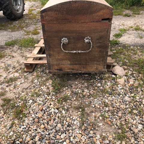 Træ kiste med jern beslag til bla. hængelås og med bærbare håndtag i siderne. Valnøde-farvet, massiv træ