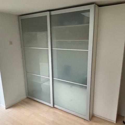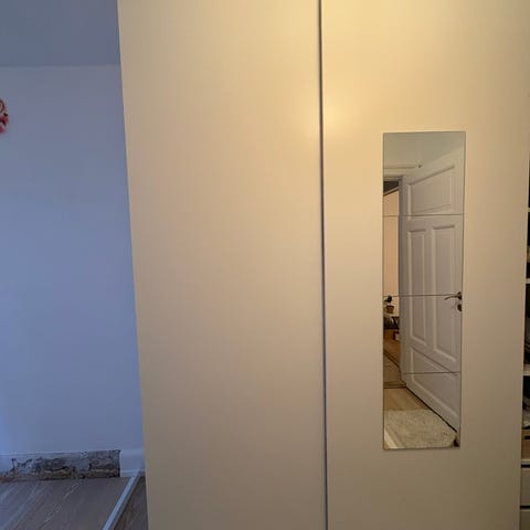 Selve skabskabinettet har desværre fået en transportskade på bagsiden under flytning, og vi har boret en skrue ud gennem skabets højre side (ja, det var idiotisk, men det kan være en udfordring at samle et IKEA-møbel ...). Hvis skabets højre side står op ad en væg, er det ikke et problem, men alternativt kan et nyt pax-kabinet købes i IKEA, og du kan stadig få skabslågerne og al indmaden til en ottendedel af prisen.