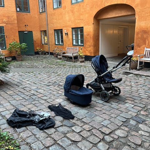 Barnevognen er i god stand. Læderet på styret er dog slidt og madrassen bør rengøres. Se billeder.