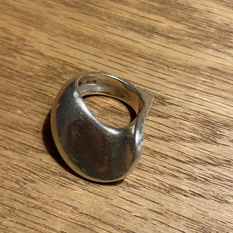 Skulpturel, organisk ring i sterlingsølv (925S) fra Hans Hansen, Kolding, stemplet “925S HaH” (se foto). Klassisk dansk modernisme med en asymmetrisk “bølgeform”, der fungerer som statement-ring.