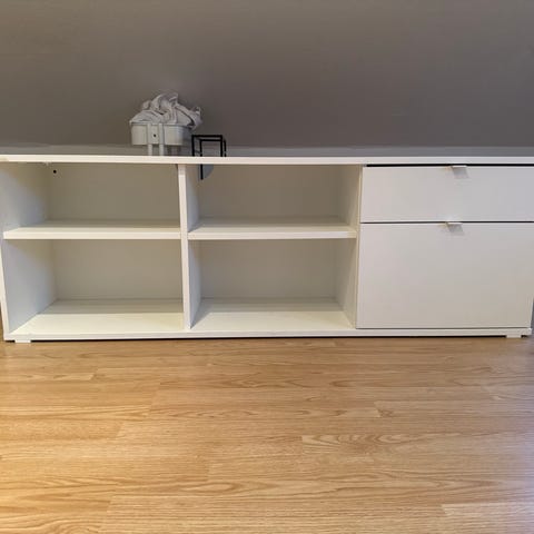 Flot simpelt sort TV bord til salg. Vi skal have et nyt. To dybe gode skuffer og to hylder.