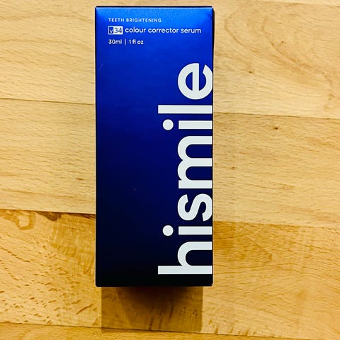 Hismile V34 Colour Corrector Serum i 30 ml emballage. Produktet er designet til at forbedre tandfarven og reducere misfarvninger. Serum anvendes til mundpleje og indeholder ingredienser som glycerin, natriumfluorid og aroma. Produktet er velegnet til voksne.