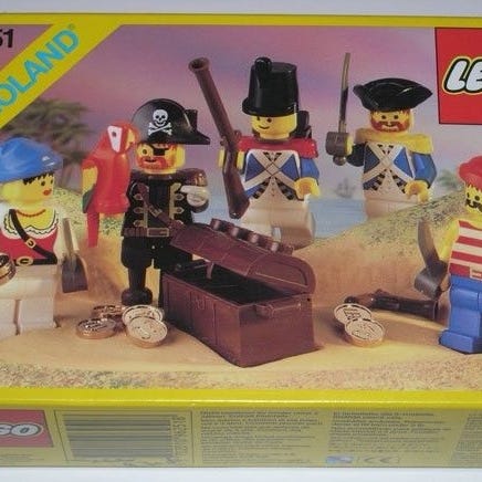 LEGO 6251 Legoland piratfigurer med fem minifigurer i forskellige farver og udstyr, herunder pirattema og tilbehør som kiste og våben.