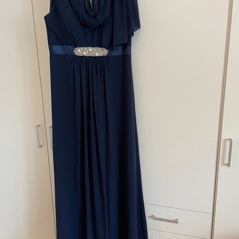 Halvlang/maxi lyseblå kjole med kort “net” ærme, V-hals med blondekant, med skulderpuder, toppen af kjolen er blondestof, skørtet er med vidde - vidde forneden 180 cm. Brugt få gange. I pæn stand.