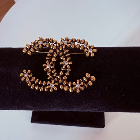 Chanel broche til kvinder udført i sølv med dekorative perler. Brochen har det karakteristiske Chanel-logo og er designet som et smykke til påsætning på tøj eller accessories.