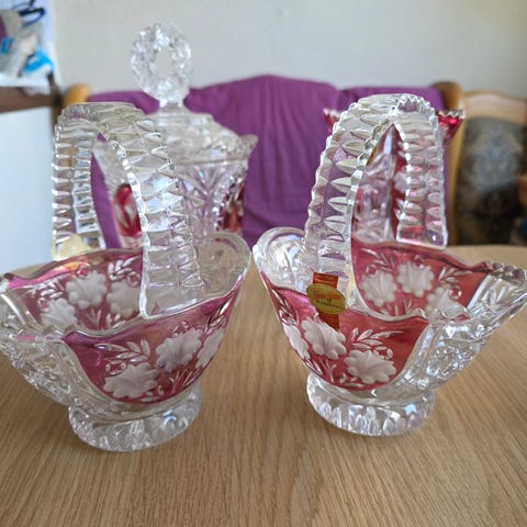 Anna Hutte Blykrystal krystalvaser i rubinrødt og klart blomstermønster. Lavet i Tyskland af 24% blykrystal (Bleikristall) Har et blomstermønster i slebet glas og en buet, savtakket kant Omkring 15 cm i højden.