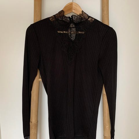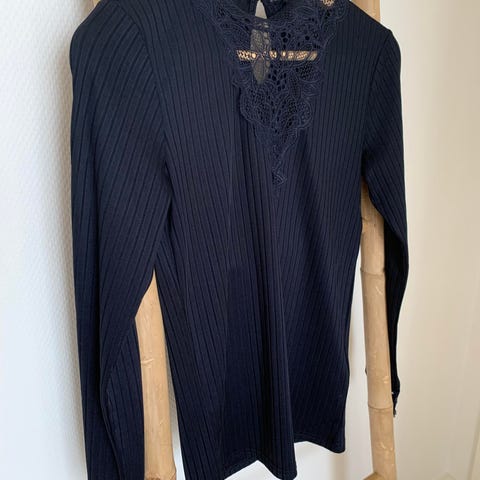 - Ribbet langærmet top - Høj hals - Blondedetalje ved overstykke og ærmekanter - Slim fit