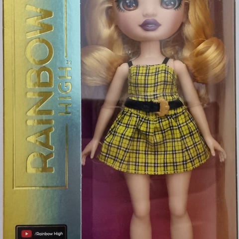 Dukken er i ny stand. Har flade fødder. Hund med kurv følger med.