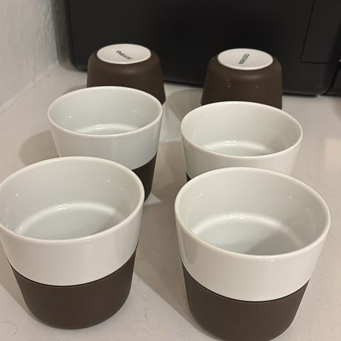 Eva Solo Eva Trio kaffekopper i porcelæn. Sættet indeholder flere hvide kaffekopper med et ribbet mønster. Kaffekopperne er designet til servering af kaffe og andre varme drikke.