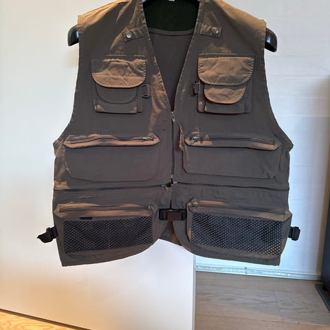 • Beige-farvet vest med lynlås-lommer, samt forskellige lommetyper til opbevaring.
