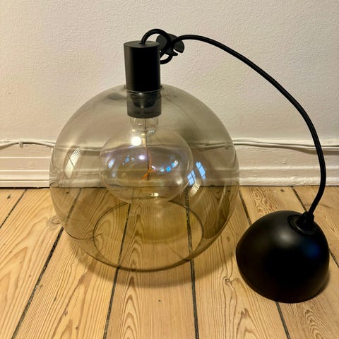 Flot loftslampe i glas fra Ikea. Filament pære, som er stort set ubrugt, da vi har brugt en hue pære i stedet for. Pæren måler ca. 20 cm. I alt og lampen er 27 cm. I diameter.