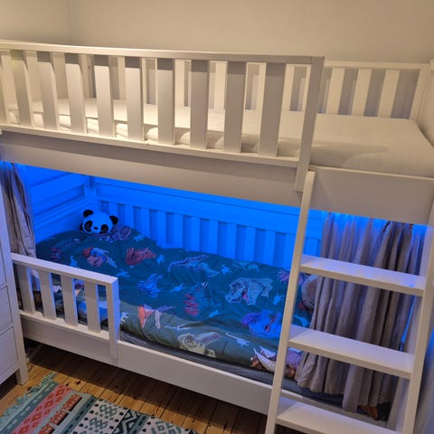 IKEA køjeseng i træ med stige. Sengen er fremstillet i træmateriale og har en naturlig træfarve. Den består af to sovepladser, en øvre og en nedre, og inkluderer en integreret stige til adgang til den øverste seng. Sengen leveres med nødvendige beslag og skruer til montering.