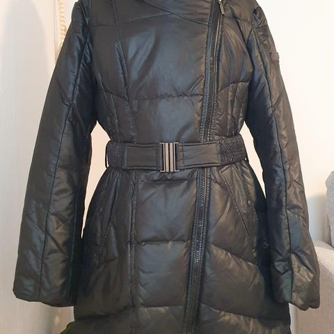Dunjakke fra Esprit. Str. XS. Farve sort. Aftagelig hætte og kunstpels. Prismærket stadigvæk findes. Brugt, men godt.