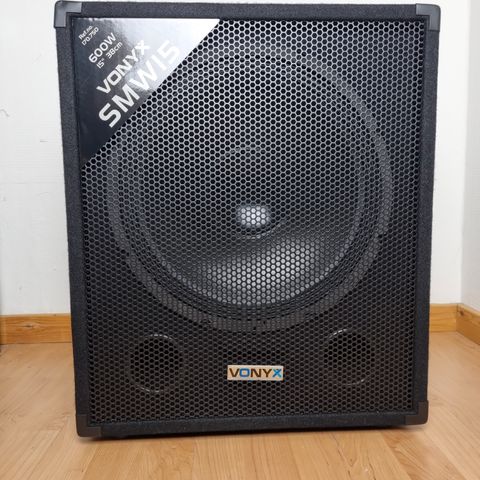 Vonyx SWA15 aktiv subwoofer med indbygget forstærker. Sort kabinet med frontgitter. Tilslutninger inkluderer XLR og RCA line input. Velegnet til lydforstærkning ved musik og events.