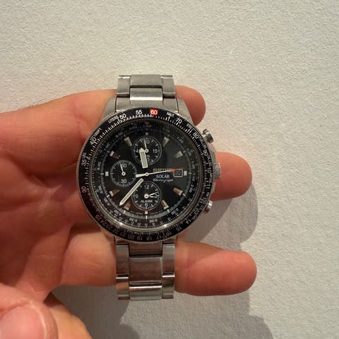 Seiko herreur med sort urskive, chronograph funktion og sort gummirem. Uret har en robust urkasse og er designet til daglig brug. Give en seriøse bud
