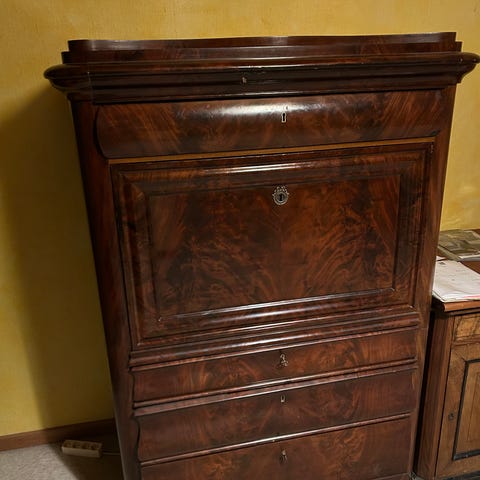 Klassisk sekretærskab i mørkt træ med integreret skriveklap.