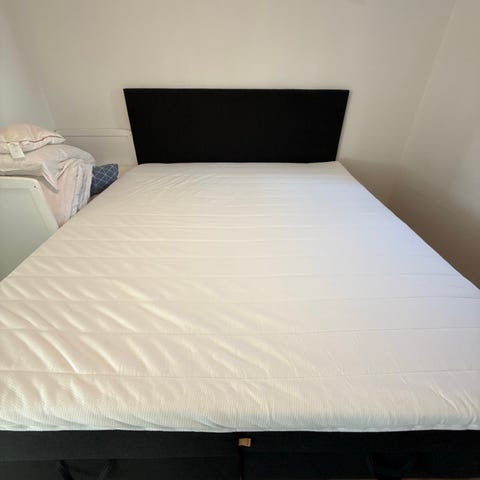Sælges begrund af flytning. Og sælges UDEN topmadressen (dog med 2 enkelte madrasser) og der er 1 knækket bredt i højre side, men mærkes overhovedet ikke når man ligger i den (sengelameller kan købes til under 200) ellers står sengen og gavl som NY.