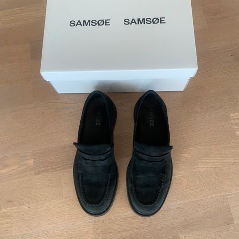Sam's herre sko i størrelse 42. Skoene er sorte med snørebinding og har en rød detalje bagpå. Materialet fremgår ikke specifikt. Skoene leveres i original æske.