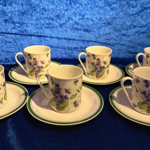 I hel og pæn stand - eneste anmærkning er den ene blå stribet kop, som har en lille sort streg (se billede).