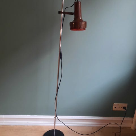 Mini standerlampe, bordlampe med grøn skærm og metalstel. Lampen har justerbar arm og er velegnet til brug som skrive- eller læselampe.